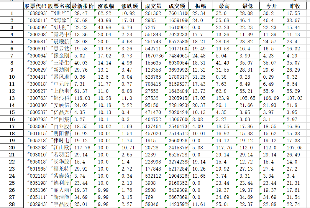 columns = {11:"股票代码",13:"股票名称",1:"最新报价",2:"涨跌幅",3:"涨跌额",4:"成交量",5:"成交额",6:"振幅",14:"最高",15:"最低",16:"今开",17:"昨收"}