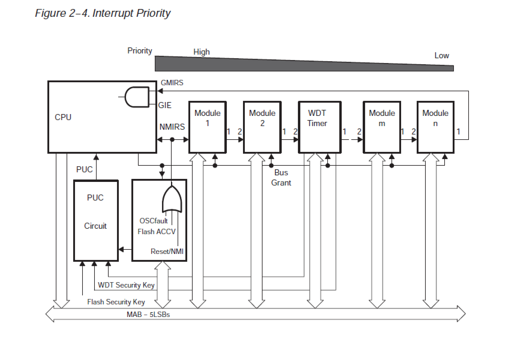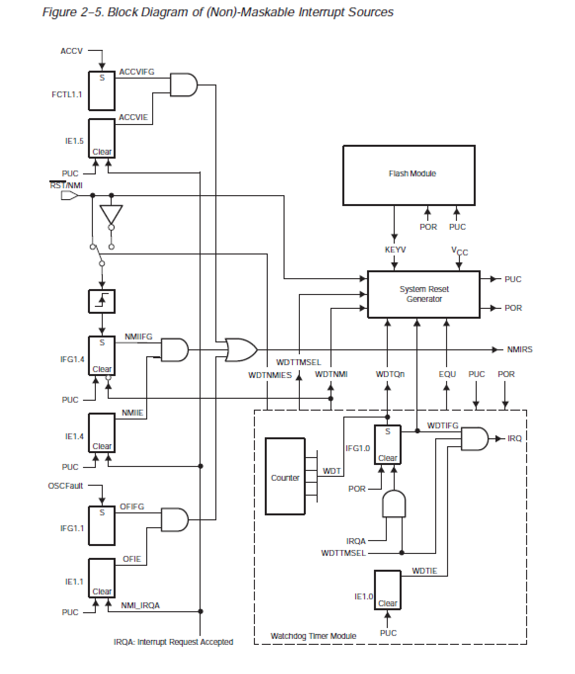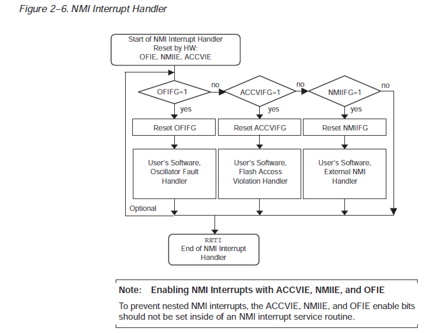 非可屏蔽中断:不论GIE是什么状态,只要非可屏蔽中断/复位管脚(RST/NMI)的中断条件得到满足,就会向CPU发送中断请求。