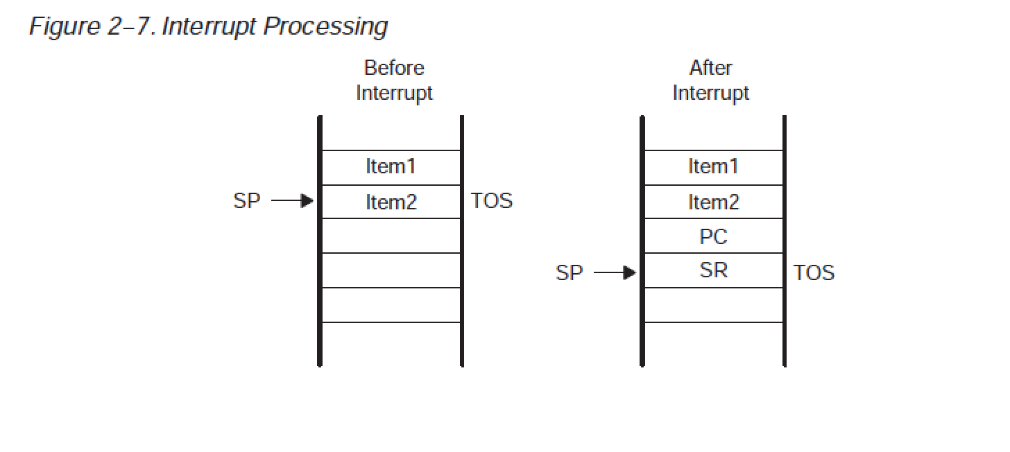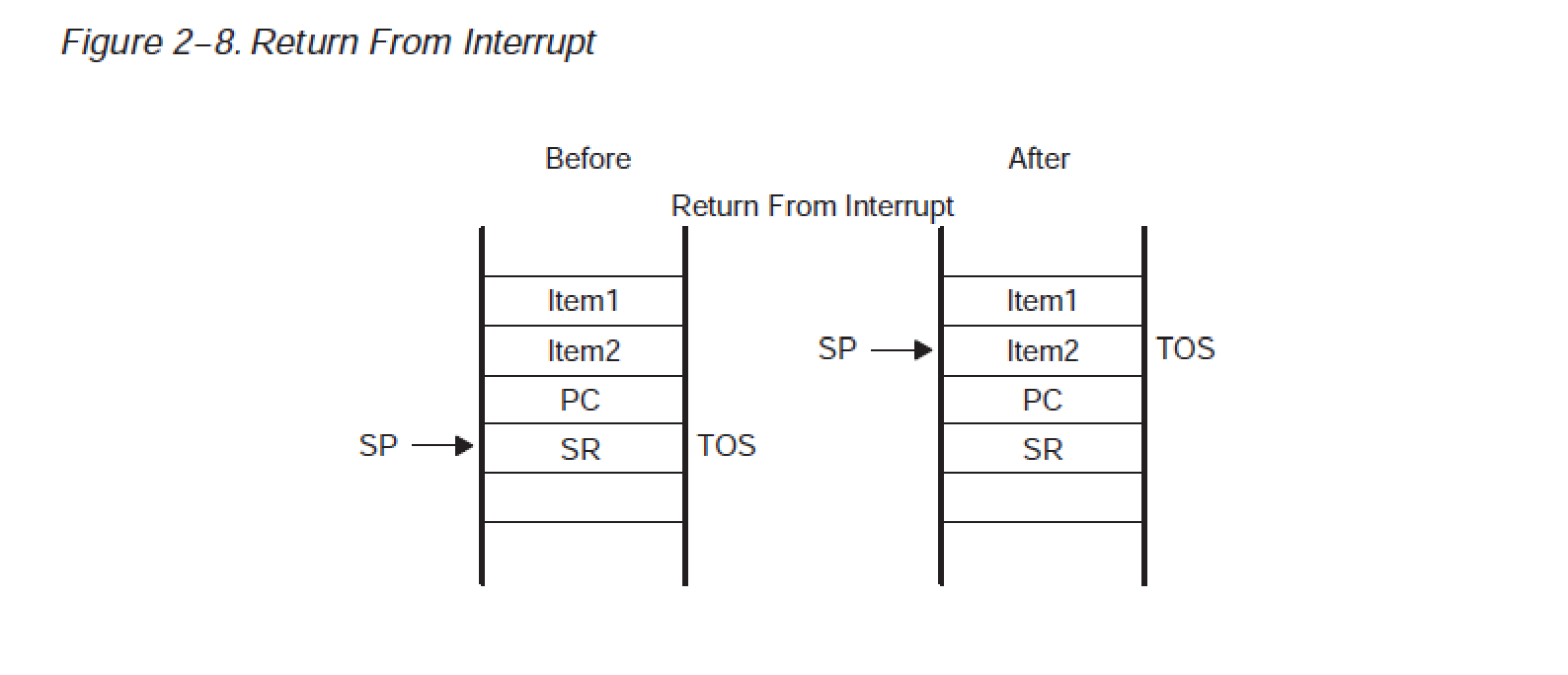 - 正常程序运行时状态寄存器(SR)从堆栈中弹出,GIE、CPUOFF恢复为原来的位置。