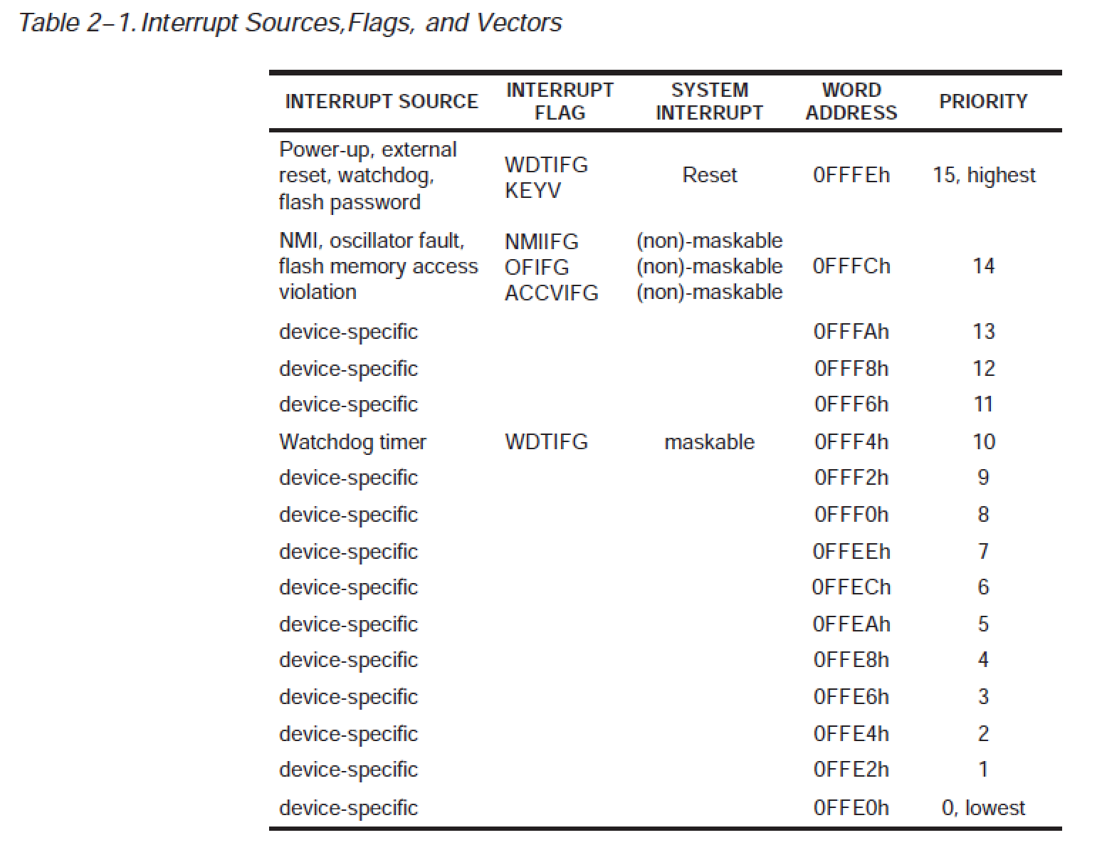 可屏蔽中断可由状态寄存器(SR)中的通用中断使能(GIE)位控制。置位,打开可屏蔽中断。复位,屏蔽所有可屏蔽中断。