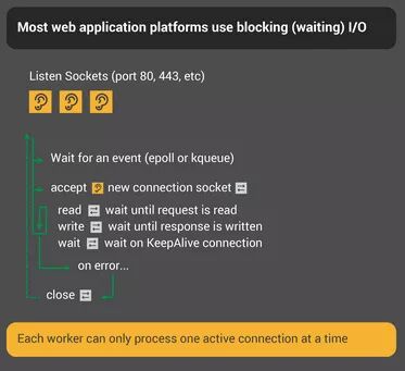 记住每一个活跃的HTTP连接即每一局象棋游戏,需要象棋大师一般的特定进程或者线程参与其中。这个架构简单易于扩展第三方模型即新的规则。然而,这里存在一个极不平衡的逻辑,对于相关轻量级的HTTP连接,由单个文件描述符和少量的内存表示,此连接会映射到某个线程或进程上,而线程或者进程是一个重量级的操作系统对象。尽管编程时很方便,但浪费却是巨大的。