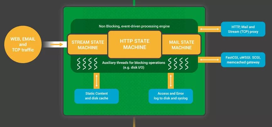 工作进程起始于socket监听事件(accept_mutex 和 kernel socket sharding),事件由新的连接进行初始化,接着这些连接被派发给某个状态机—HTTP状态机是其中最常用的一种,不过NGINX也实现了基于流的状态机、基于通信协议的状态机(SMTP, IMAP, and POP3)。