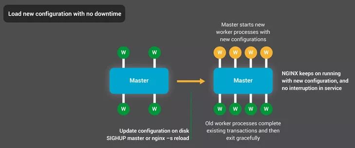更新NGINX配置是一个简单、轻量级的可靠操作。即只要运行nginx -s reload命令,就会检查磁盘上的配置文件,并给主进程发送一个SIGHUB信号。