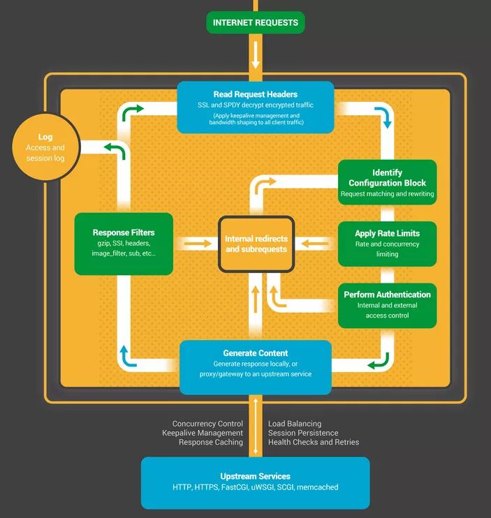 NGINX内部信息图展示了NGINX的高标准功能全景图,简单解释的背后是十多年来不断创新优化,得益于此NGINX被广泛应用于各种硬件平台,并且取得了最优异的性能表现。即便是在现代,网络应用需要对安全和可靠性作出维护,NGINX也表现不凡。