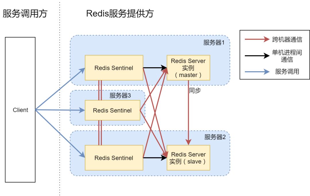 至此,我们就用3台机器搭建了一个高可用的Redis服务。其实网上还有更加节省机器的办法,就是把一个Sentinel进程放在Client机器上,而不是服务提供方的机器上。只不过在公司里面,一般服务的提供方和调用方并不来自同一个团队。两个团队共同操作同一个机器,很容易因为沟通问题导致一些误操作,所以出于这种人为因素的考虑,我们还是采用了方案4的架构。并且由于服务器3上面只跑了一个Sentinel进程,对服务器资源消耗并不多,还可以用服务器3来跑一些其他的服务。