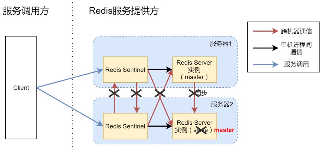 你可能会问,为什么Redis要有这个50%的设定?假设我们允许小于等于50%的Sentinel连通的场景下也可以进行主从切换。试想一下【异常3】,即服务器1和服务器2之间的网络中断,但是服务器本身是可以运行的。如下图所示: