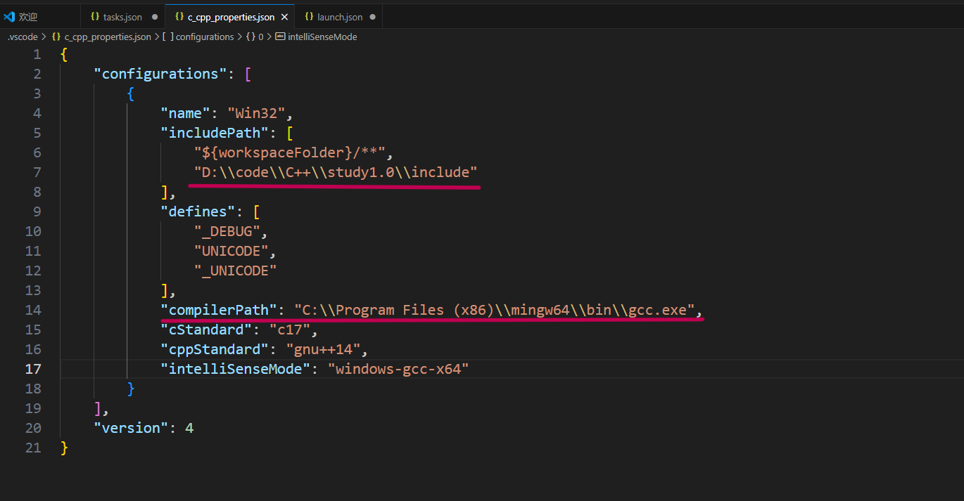 3.在搜索框输入 >C/C++:编辑配置(JSON) 得到 c_cpp_properties.json