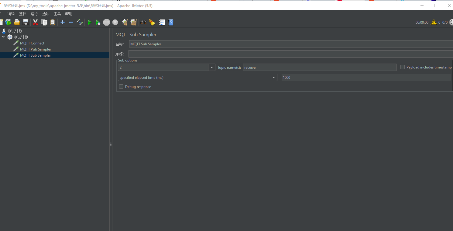 从github下载您需要的release版本, 解压mqtt–xmeter-jar-with-dependencies.jar.zip, 将生成的jar文件放到JMeter安装主目录的lib/ext下,重启JMeter,就可以看到插件成功加载。