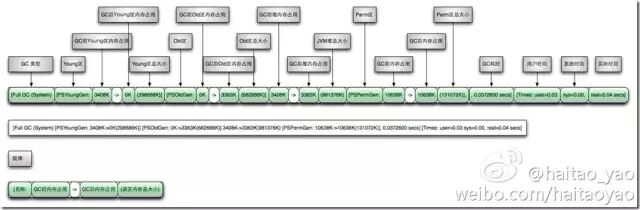 通过上面日志分析得出,PSYoungGen、ParOldGen、PSPermGen属于Parallel收集器。其中PSYoungGen表示gc回收前后年轻代的内存变化;ParOldGen表示gc回收前后老年代的内存变化;PSPermGen表示gc回收前后永久区的内存变化。young gc 主要是针对年轻代进行内存回收比较频繁,耗时短;full gc 会对整个堆内存进行回城,耗时长,因此一般尽量减少full gc的次数