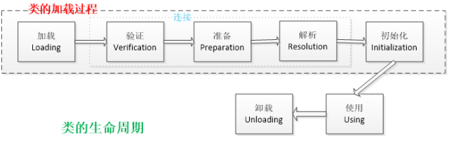 类的生命周期包括这几个部分,加载、连接、初始化、使用和卸载,其中前三部是类的加载的过程,如下图;