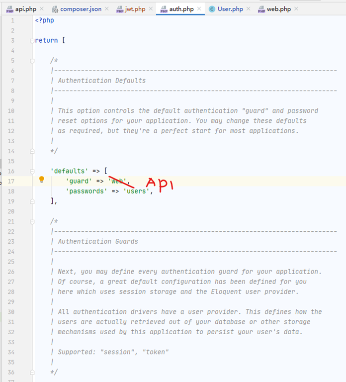 参考 https://jwt-auth.readthedocs.io/en/develop/quick-start/ Configure Auth guard 修改config/auth.php文件: