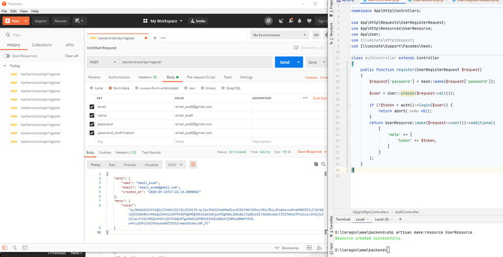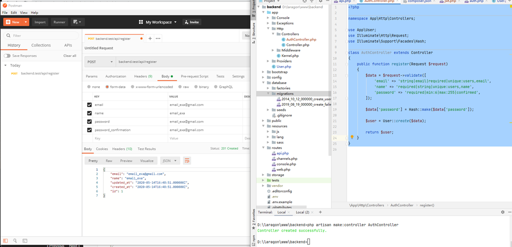<?php namespace App\Http\Controllers; use App\Http\Requests\UserRegisterRequest; use App\User; use Illuminate\Http\Request; use Illuminate\Support\Facades\Hash; class AuthController extends Controller { public function register(UserRegisterRequest $request) { $request['password'] = Hash::make($request['password']); $user = User::create($request->all()); return $user; } }