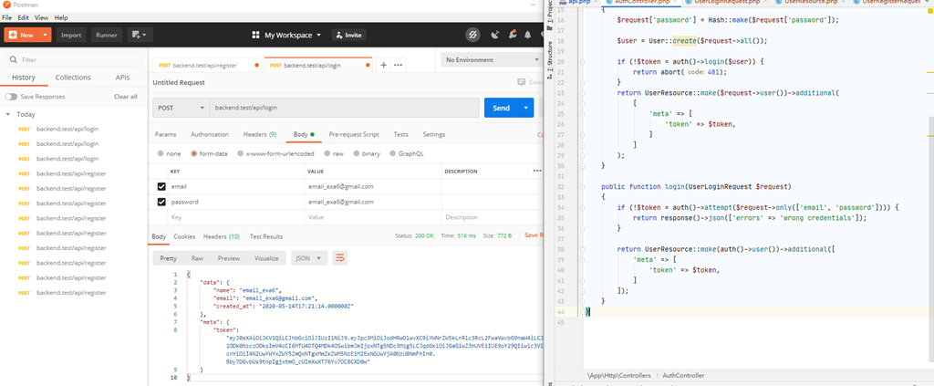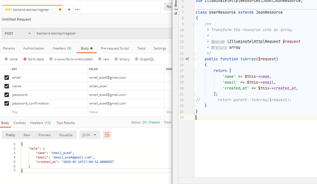 <?php namespace App\Http\Controllers; use App\User; use Illuminate\Http\Request; use Illuminate\Support\Facades\Hash; class AuthController extends Controller { public function register(Request $request) { $data = $request->validate([ 'email' => 'string|email|required|unique:users,email', 'name' => 'required|string|unique:users,name', 'password' => 'required|min:6|max:255|confirmed', ]); $data['password'] = Hash::make($data['password']); $user = User::create($data); return $user; } }