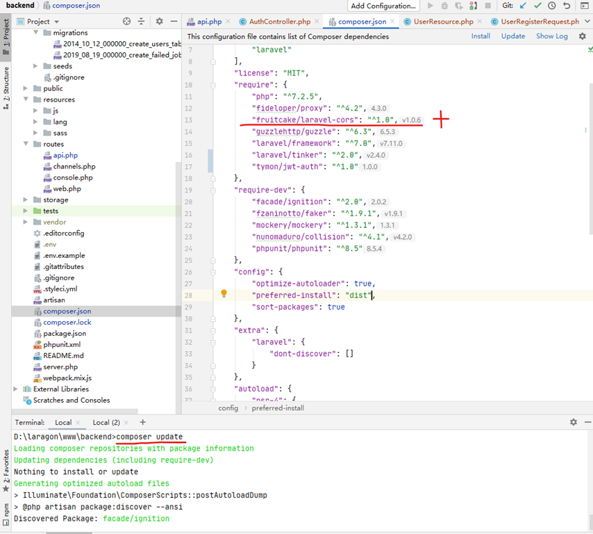 切换到backend项目:参考 https://jwt-auth.readthedocs.io/en/docs/laravel-installation/ 执行: