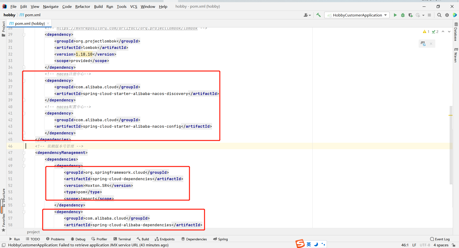 2.1 在父工程hobby的pom中,引入spring cloud和nacos的包