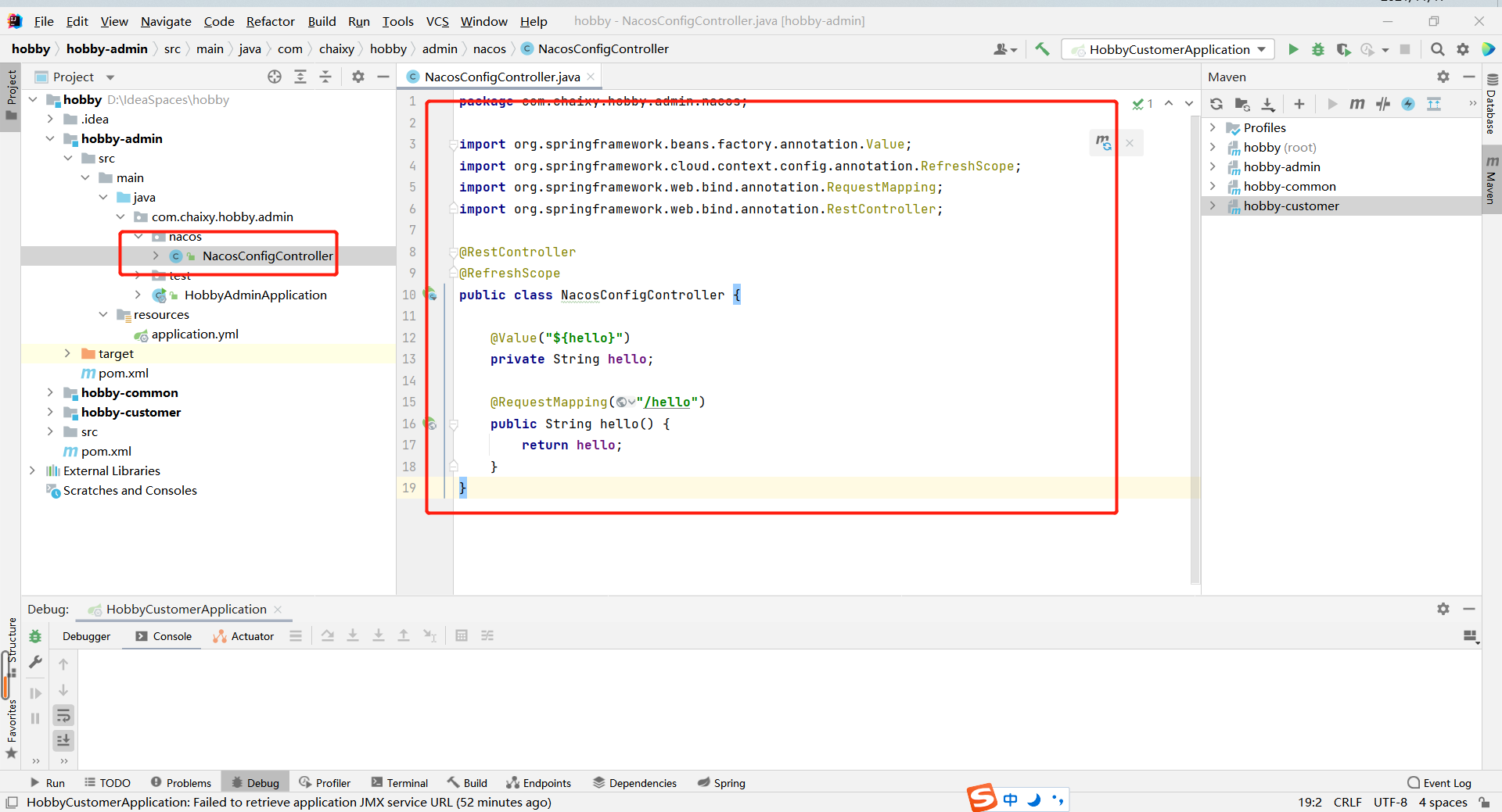 2.5 修改nacos中的配置值,再次读取,看能不能在不重启hobby-admin的情况下动态读配置
