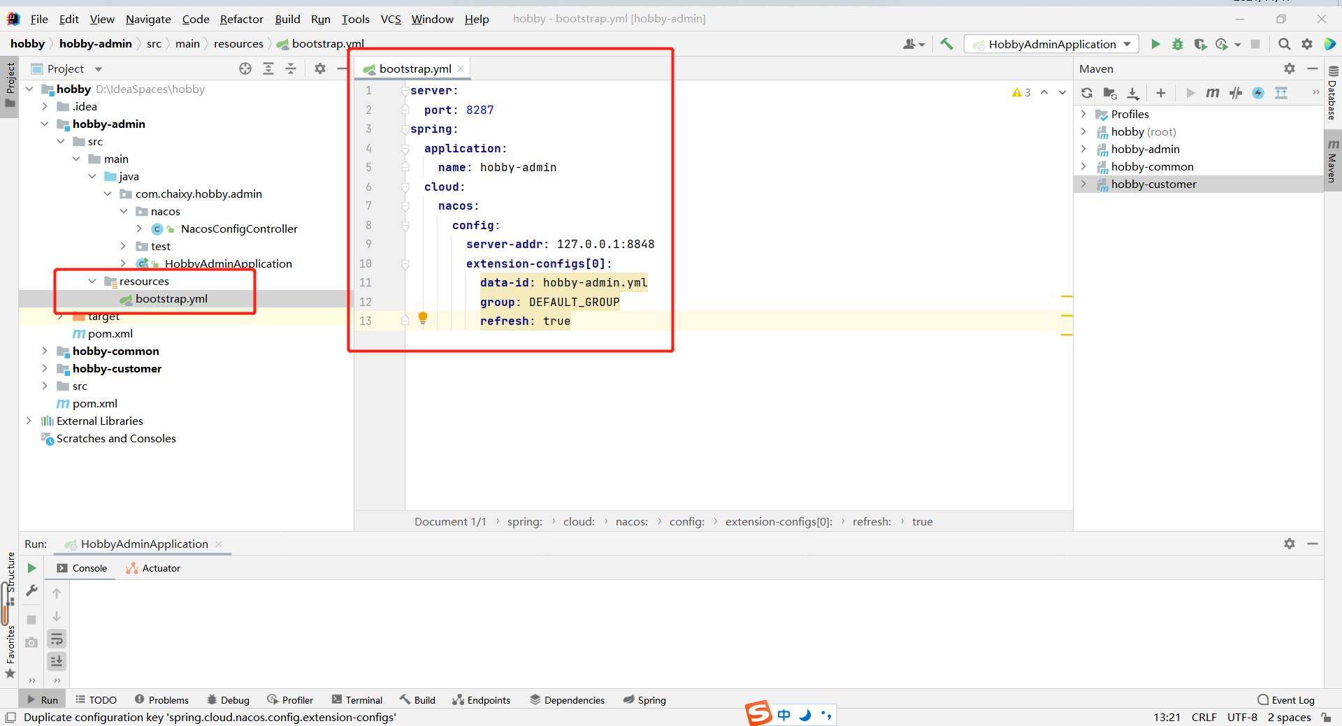2.2 将子工程hobby-admin的配置文件application.yml改名字为boostrap.yml并添加nacos配置(这里使用nacos中的yml后缀的配置文件,其实properties后缀的文件也是可以的)