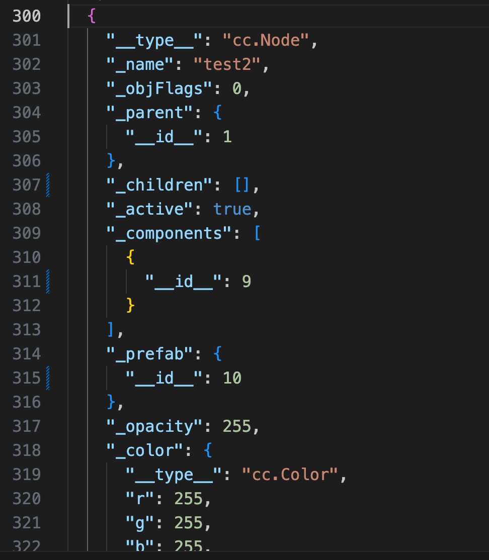 3. 每个节点都有_prefab属性, 如果为null,那么在编辑器显示白色, 不为空,显示蓝色或者绿色。 是否绿色取决于sync字段是否为true