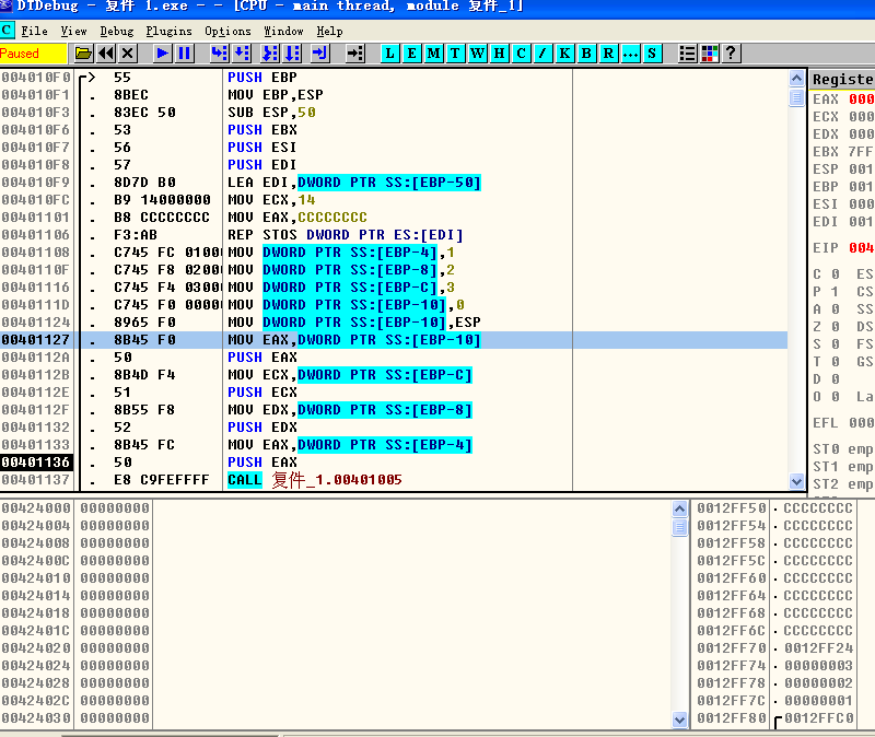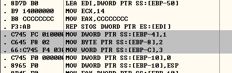 进入CALL中的时候会保存现场,提升堆栈,变量的初始化就在提升堆栈的时候一起提升的,没有变量的时候固定提升0x40个字节 ,当有变量的时候就会增加提升的字节,下图中有4个DWORD类型的数据,所以提升堆栈0x50个字节