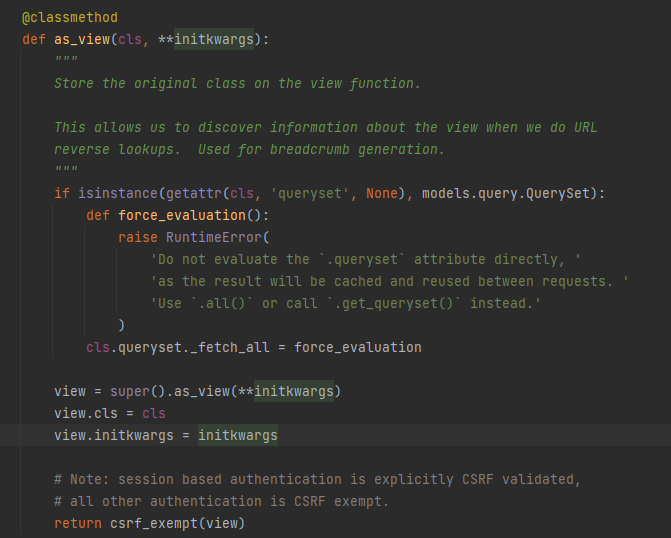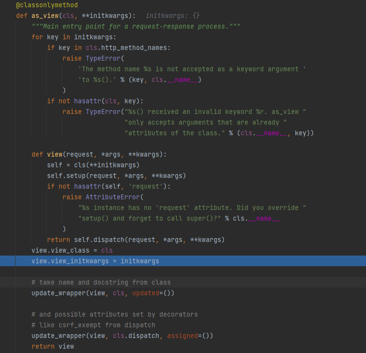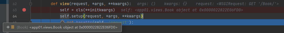 在dispatch中把参数与请求放入了self中,这个self就是上上图中的book,这也是为什么截图的原因,因为有的同学对继承还不是很了解,看源码的时候会误以为这个self是当前类的对象,其实是调用方的