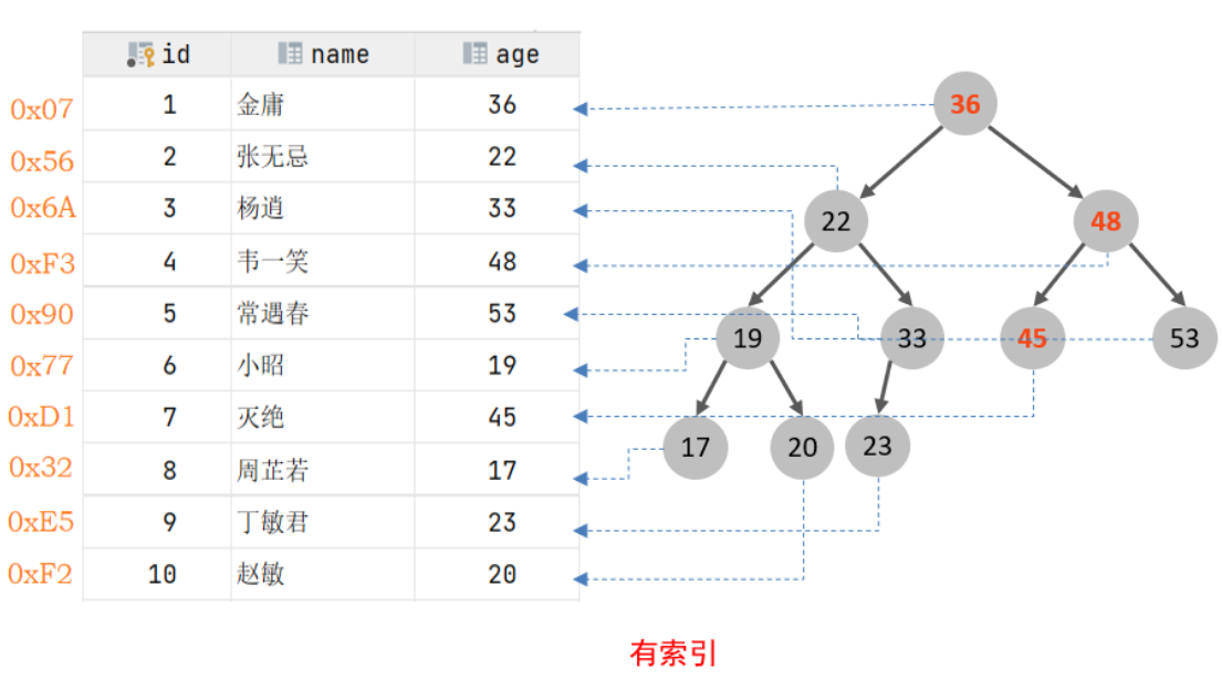 有索引情况 如果我们针对于这张表建立了索引,假设索引结构就是二叉树,那么也就意味着,会对age这个字段建 立一个二叉树的索引结构。