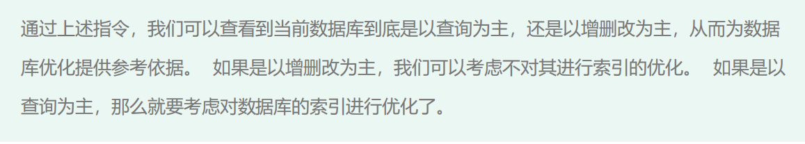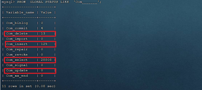 SQL执行频率查看当前数据库的INSERT、UPDATE、DELETE、SELECT的访问频次: -- session 是查看当前会话 ; -- global 是查询全局数据 ; SHOW GLOBAL STATUS LIKE 'Com_______'; 1