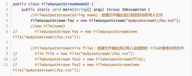 字节流写数据【应用】 字节流抽象基类 InputStream:这个抽象类是表示字节输入流的所有类的超类 OutputStream:这个抽象类是表示字节输出流的所有类的超类 子类名特点:子类名称都是以其父类名作为子类名的后缀 字节输出流 FileOutputStream(String name):创建文件输出流以指定的名称写入文件 使用字节输出流写数据的步骤 创建字节输出流对象(调用系统功能创建了文件,创建字节输出流对象,让字节输出流对象指向文件) 调用字节输出流对象的写数据方法 释放资源(关闭此文件输出流并释放与此流相关联的任何系统资源)