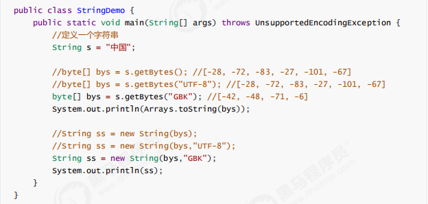 字符串中的编码解码问题【应用】 方法名 说明 byte[] getBytes() 使用平台的默认字符集将该 String编码为一系列字节 byte[] getBytes(String charsetName) 使用指定的字符集将该 String编码为一系列字节 String(byte[] bytes) 使用平台的默认字符集解码指定的字节数组来创建字符串 String(byte[] bytes, String charsetName) 通过指定的字符集解码指定的字节数组来创建字符串