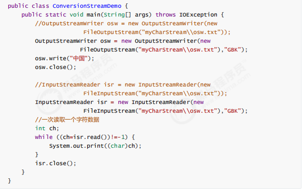 字符流中的编码解码问题【应用】 字符流中和编码解码问题相关的两个类 InputStreamReader:是从字节流到字符流的桥梁 它读取字节,并使用指定的编码将其解码为字符 它使用的字符集可以由名称指定,也可以被明确指定,或者可以接受平台的默认字符集 OutputStreamWriter:是从字符流到字节流的桥梁 是从字符流到字节流的桥梁,使用指定的编码将写入的字符编码为字节 它使用的字符集可以由名称指定,也可以被明确指定,或者可以接受平台的默认字符集 方法名 说明 InputStreamReader(InputStream in) 使用默认字符编码创建InputStreamReader对 象 InputStreamReader(InputStream in,String chatset) 使用指定的字符编码创建InputStreamReader 对象 OutputStreamWriter(OutputStream out) 使用默认字符编码创建OutputStreamWriter对 象 OutputStreamWriter(OutputStream out,String charset) 使用指定的字符编码创建OutputStreamWriter 对象