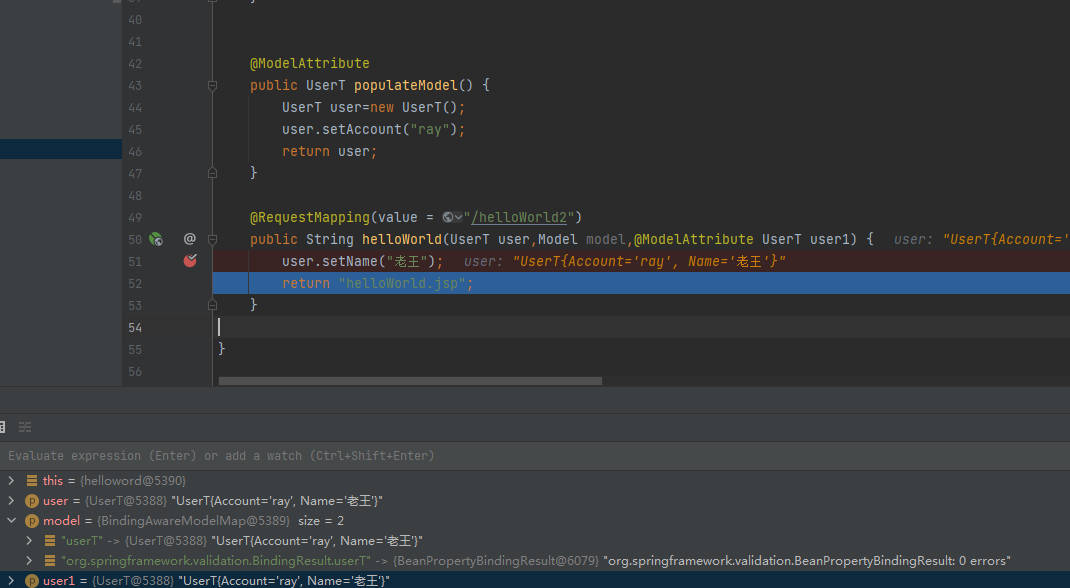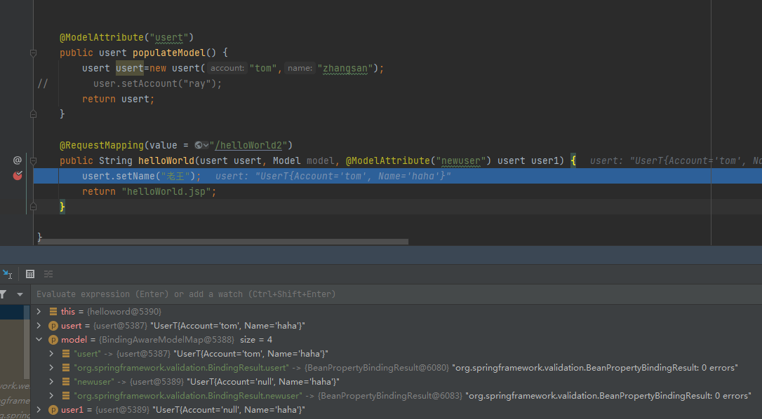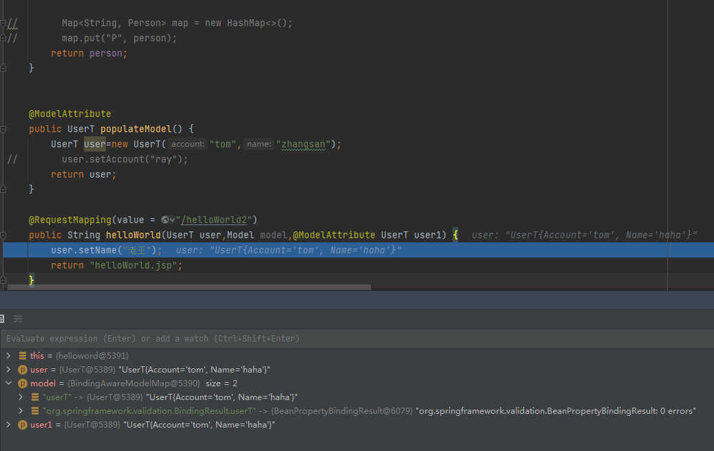 @Controller public class Hello2ModelController { @ModelAttribute public User populateModel() { User user=new User(); user.setAccount("ray"); return user; } @RequestMapping(value = "/helloWorld2") public String helloWorld(User user) { user.setName("老王"); return "helloWorld.jsp"; } }