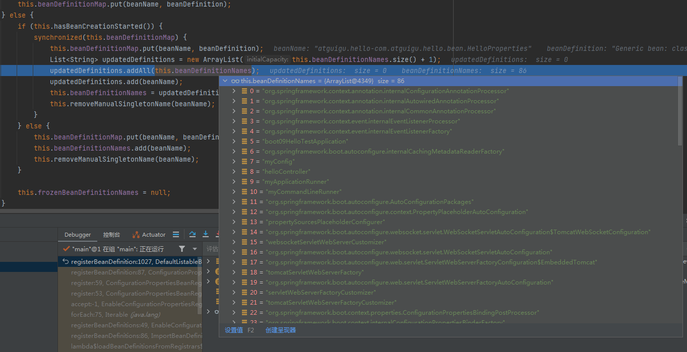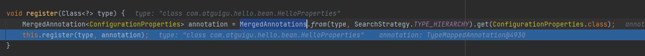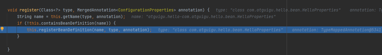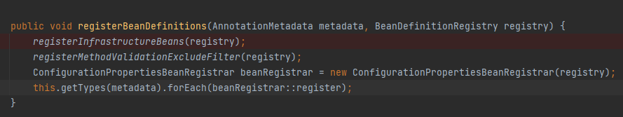 new配置属性bean注册对象,进入forEach 得到需要注册的bean,也就是配置属性类,