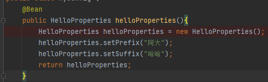 @Configuration public class MyConfig { @Bean public HelloProperties helloProperties(){ HelloProperties helloProperties = new HelloProperties(); helloProperties.setPrefix("阿大"); helloProperties.setSuffix("哈哈"); return helloProperties; } // @Bean public HelloService helloService(){ HelloService helloService = new HelloService(); return helloService; } }