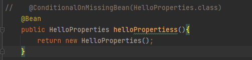 @ConditionalOnMissingBean(HelloProperties.class) @Bean public HelloProperties helloProperties(){ return new HelloProperties(); }