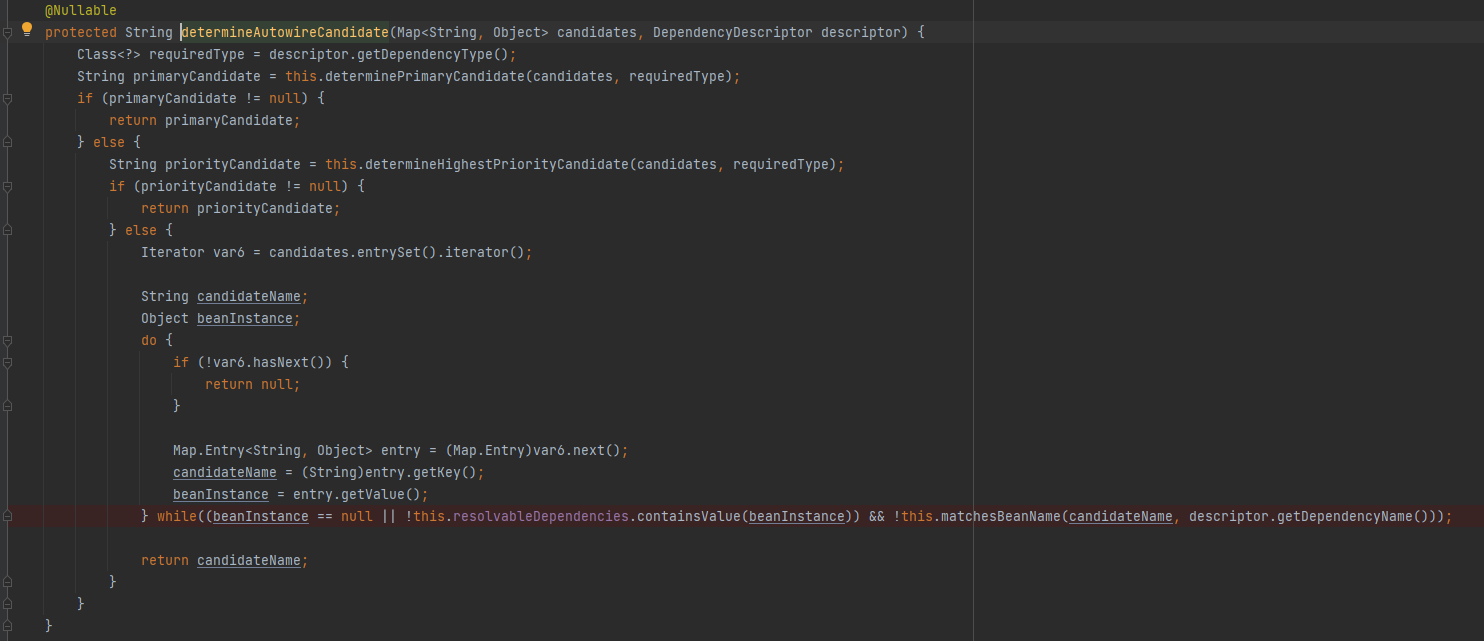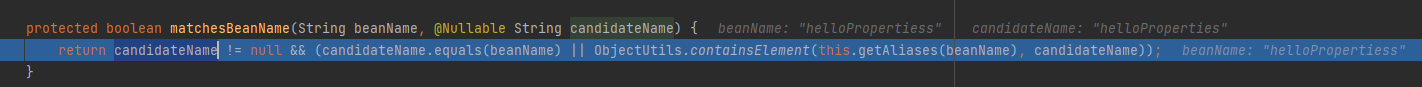 在while条件中matchesBeanNam中传入候选名 和属性名,判断是否一致, 这也是为啥 和类名保持一致 就 不会报错的原因
