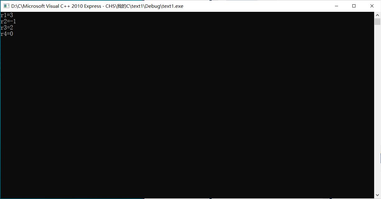 #include<stdio.h> int main() { int x,y; int r1,r2,r3,r4; x=1; y=2; r1=x+y; r2=x-y; r3=x*y; r4=x/y; printf("r1=%d\n",r1); printf("r2=%d\n",r2); printf("r3=%d\n",r3); printf("r4=%d\n",r4); getchar(); return 0; }