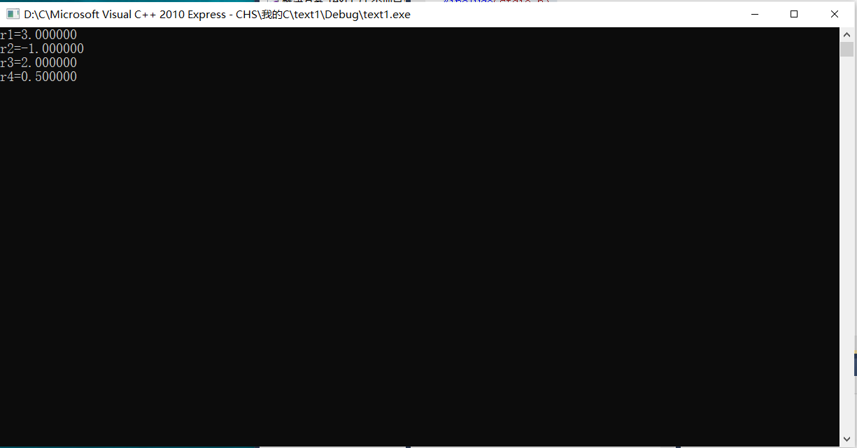 #include<stdio.h> int main() { float x,y; float r1,r2,r3,r4; x=1; y=2; r1=x+y; r2=x-y; r3=x*y; r4=x/y; printf("r1=%f\n",r1); printf("r2=%f\n",r2); printf("r3=%f\n",r3); printf("r4=%f\n",r4); getchar(); return 0; }