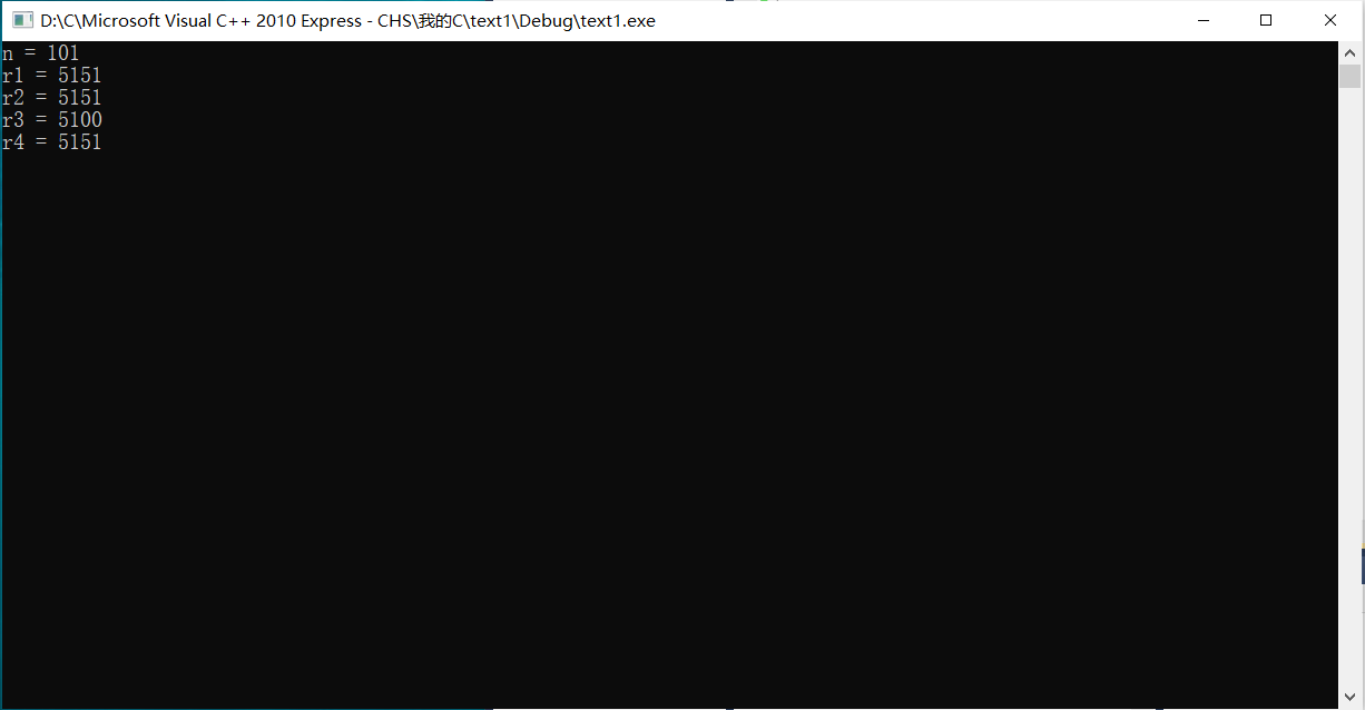 #include<stdio.h> int main() { int n, r1, r2, r3, r4; n = 101; r1 = n * (n + 1) / 2; r2 = (n + 1) * n / 2; r3 = n / 2 * (n + 1); r4 = (n + 1) / 2 * n; printf("n = %d\n", n); printf("r1 = %d\n", r1); printf("r2 = %d\n", r2); printf("r3 = %d\n", r3); printf("r4 = %d\n", r4); getchar(); return 0;}