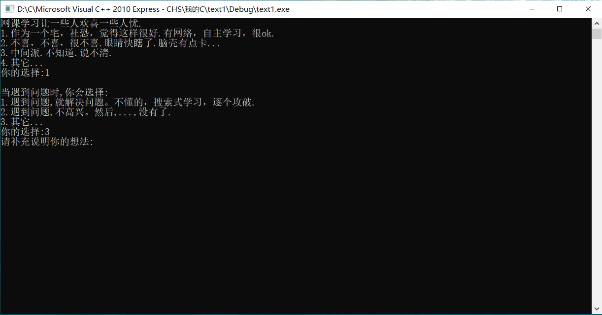 #include<stdio.h> int main() { int answer; char words[5000]; printf("网课学习让一些人欢喜一些人忧.\n"); printf("1.作为一个宅,社恐,觉得这样很好.有网络,自主学习,很ok.\n"); printf("2.不喜,不喜,很不喜.眼睛快瞎了.脑壳有点卡...\n"); printf("3.中间派.不知道.说不清.\n"); printf("4.其它...\n"); printf("你的选择:"); scanf_s("%d", &answer); if (answer == 4) { printf("请补充说明你的想法:\n"); getchar(); gets(words); } printf("\n");//换行 printf("当遇到问题时,你会选择:\n"); printf("1.遇到问题,就解决问题。不懂的,搜索式学习,逐个攻破.\n"); printf("2.遇到问题,不高兴。然后,...,没有了.\n"); printf("3.其它...\n"); printf("你的选择:"); scanf_s("%d", &answer); if (answer == 1) printf(":)\n"); else if (answer == 2) printf("这样不能解决问题啊...我们选择1好不好:)\n"); else if (answer == 3) { printf("请补充说明你的想法:\n"); getchar(); gets(words); } return 0; }