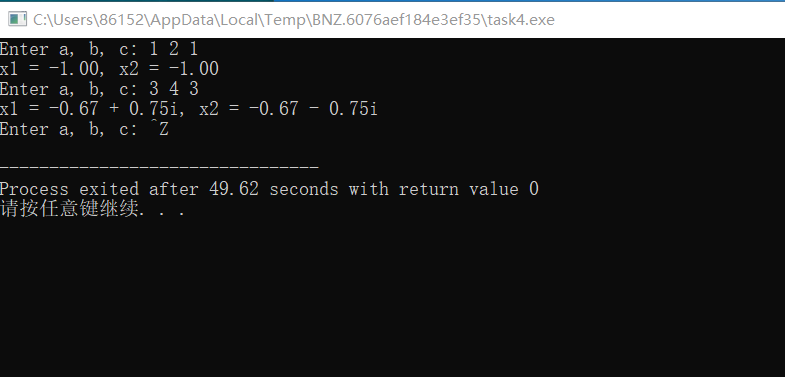 #include <math.h> #include <stdio.h> void solve(double a, double b, double c); int main() { double a, b, c; printf("Enter a, b, c: "); while(scanf("%lf%lf%lf", &a, &b, &c) != EOF) { solve(a, b, c); printf("Enter a, b, c: "); } return 0; } void solve(double a, double b, double c) { double x1, x2; double delta, real, imag; if(a == 0) printf("not quadratic equation.\n"); else { delta = b*b - 4*a*c; if(delta >= 0) { x1 = (-b + sqrt(delta)) / (2*a); x2 = (-b - sqrt(delta)) / (2*a); printf("x1 = %.2f, x2 = %.2f\n", x1, x2); } else { real = -b/(2*a); imag = sqrt(-delta) / (2*a); printf("x1 = %.2f + %.2fi, x2 = %.2f - %.2fi\n", real, imag, real, imag); } } }