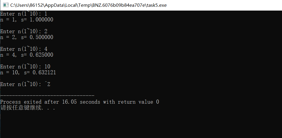 #include <stdio.h> double fun(int n); // 函数声明 int main() { int n; double s; printf("Enter n(1~10): "); while(scanf("%d", &n) != EOF) { s = fun(n); // 函数调用 printf("n = %d, s= %f\n\n", n, s); printf("Enter n(1~10): "); } return 0; } // 函数定义 double fun(int n) { double s=1,x=1; int i; if(n==1) return 1; else{ for(i=2;i<=n;i++){ x=-x*1/i; s=s+x; } return s; } }
