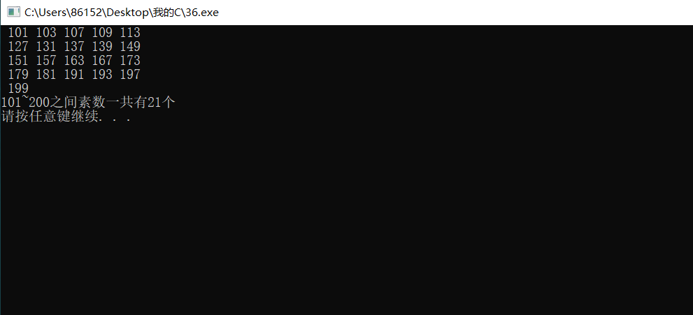 #include<stdio.h> #include<stdlib.h> int isPrime(int); int main(){ int i=0,x,s,sum=0; for(x=101;x<=200;x++){ s=isPrime(x); if(s==0){ printf(" %d",x); i++; x++; sum++; if(sum%5==0) { printf(" \n"); } } } printf("\n101~200之间素数一共有%d个\n",i); system("pause"); return 0; } int isPrime (int x) { int n=0,i; for(i=2;i<x;i++){ if(x%i==0) n++; }return n; }