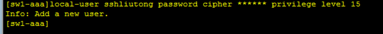 [sw1-aaa] local-user sshadmin password cipher ssh.123 privilege level 15