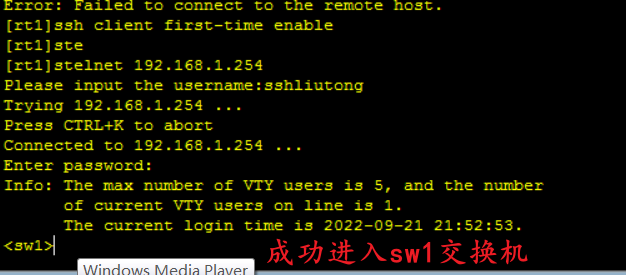 [RT1] stelnet 192.168.1.254 # 用来从当前设备使用STelnet协议登录到其他设备。