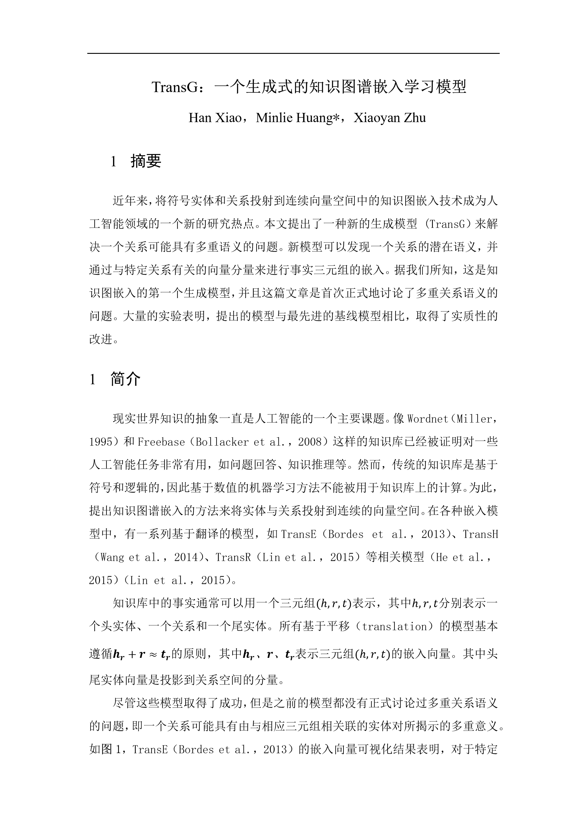 Xiao H, Huang M, Zhu X. TransG: A generative model for knowledge graph embedding[C]//Proceedings of the 54th Annual Meeting of the Association for Computational Linguistics (Volume 1: Long Papers). 2016: 2316-2325.