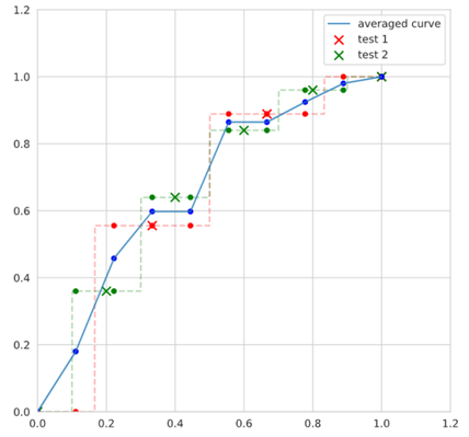 为了实验结果的有效性减少偶然性,我们经常需要重复实验,平均多个结果。但是像类似auc曲线的这种东西,每次出来的一条折线的拐点都是不对齐的,这时该如何平均多条曲线呢?此时可以先通过插值,计算指定横坐标上某次实验roc曲线的y值,再对多次实验的y值取平均,确定最终曲线上的一个点。连接所有点得到最终曲线。如下图,×是真实数据点,⚪是通过最近插值得到的点,蓝线是平均两次实验结果得到的曲线。
