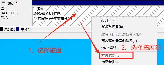 第二步:右键【待扩容的磁盘】选择【拓展卷】