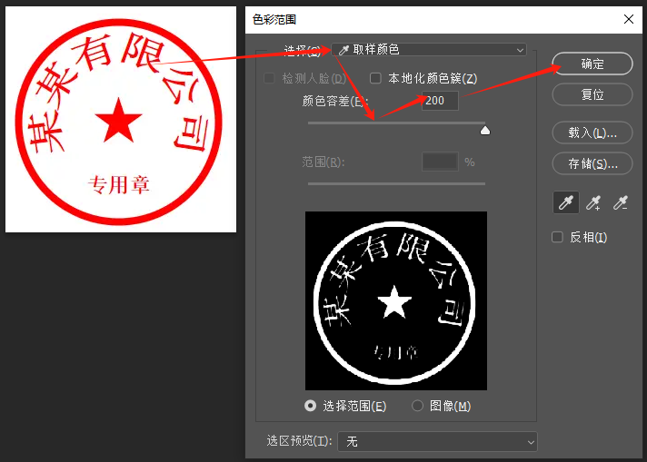 方法一:点击【选择】选择【颜色】调整【色彩范围】调整颜色容差,然后点击【确定】