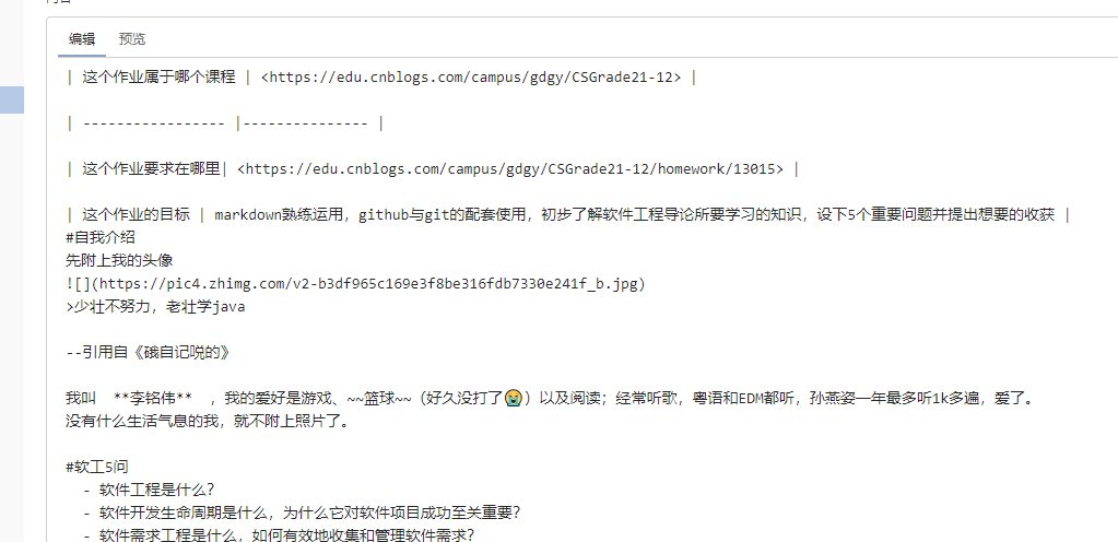| 这个作业的目标 | markdown熟练运用,github与git的配套使用,初步了解软件工程导论所要学习的知识,设下5个重要问题并提出想要的收获 |