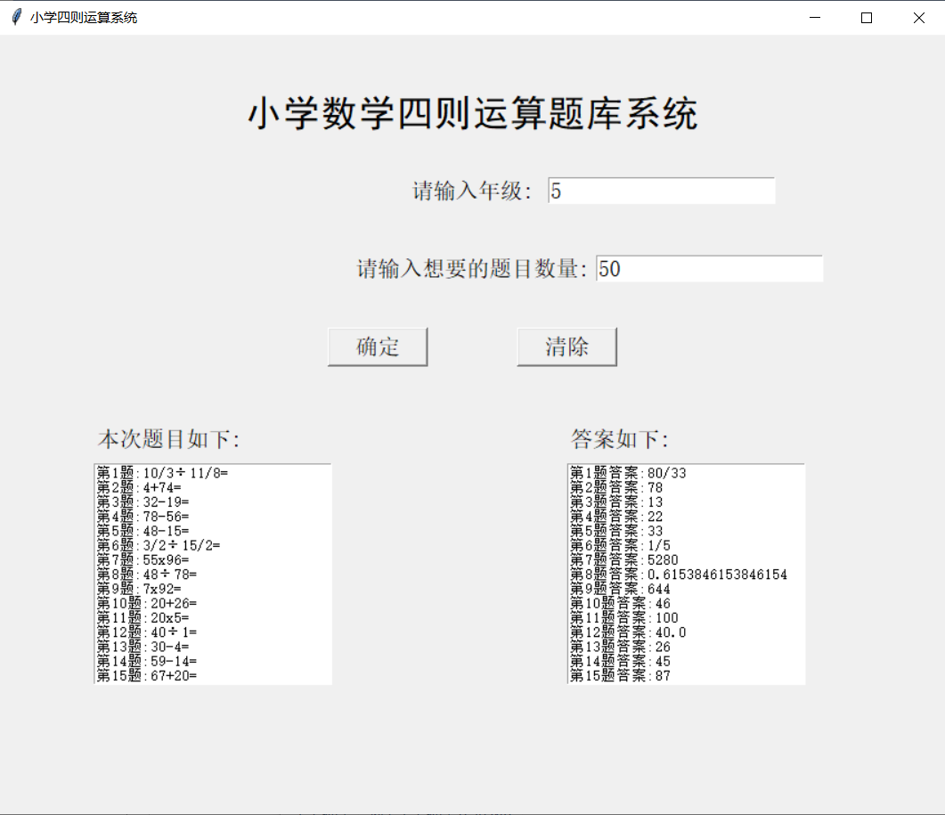 1 #创建窗口 2 window=Tk() 3 window.title("小学四则运算系统") #窗口名 4 window.geometry("850x700") #宽x高 5 6 #创建label 7 label1=Label(window,text="小学数学四则运算题库系统",font=('黑体',25)) 8 label2=Label(window,text='请输入年级:',font=20) 9 label3=Label(window,text='请输入想要的题目数量:',font=20) 10 label4=Label(window,text='本次题目如下:',font=20) 11 label5=Label(window,text='答案如下:',font=20) 12 13 #创建输入框 14 entry1=tk.Entry(window, show=None, font=14) # 显示成明文形式 15 entry2=tk.Entry(window, show=None, font=14) # 显示成明文形式 16 entry1.pack() 17 entry2.pack() 18 19 #创建题库显示框 20 display_q=tk.Text(window,width=30,height=15) 21 display_q.pack() 22 23 #创建答案显示框 24 display_a=tk.Text(window,width=30,height=15) 25 display_a.pack() 26 27 # 清除键框 28 def delete(display_q,display_a): 29 entry1.delete(0,'end') 30 entry2.delete(0,'end') 31 display_q.delete(1.0,tkinter.END) 32 display_a.delete(1.0,tkinter.END) 33 34 #创建按钮 35 button_deter=tk.Button(window, text='确定', width=8,height=1,font=20, command=lambda:run(entry1.get(),entry2.get())) 36 button_clear=tk.Button(window, text='清除', width=8,height=1,font=20,command=lambda:delete(display_q,display_a)) 37 button_deter.pack() 38 button_clear.pack() 39 40 #最后的参数描写 41 label1.place(relx=0.5,rely=0.1,anchor=CENTER) 42 label2.place(relx=0.5,rely=0.2,anchor=CENTER) 43 label3.place(relx=0.5,rely=0.3,anchor=CENTER) 44 label4.place(relx=0.1,rely=0.5) 45 label5.place(relx=0.6,rely=0.5) 46 button_deter.place(relx=0.4,rely=0.4,anchor=CENTER) 47 button_clear.place(relx=0.6,rely=0.4,anchor=CENTER) 48 entry1.place(relx=0.7,rely=0.2,anchor=CENTER) 49 entry2.place(relx=0.75,rely=0.3,anchor=CENTER) 50 display_q.place(relx=0.1,rely=0.55) 51 display_a.place(relx=0.6,rely=0.55) 52 53 window.mainloop()