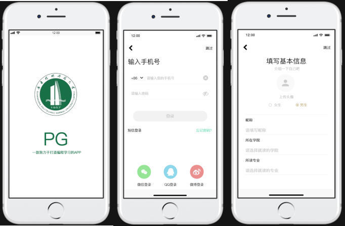 这是一款致力于打造编程学习平台的APP,主要用手机号、微信、QQ登录,基本信息里面包括性别、所在学院、所学专业。